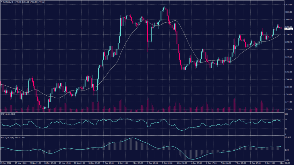 يظهر على الرسم البياني للأربع ساعات والرسم البياني اليومي احتمالية عالية لاستمرار الاتجاه الصعودي على الرغم من قراءات المؤشرات الفنية. ومع ذلك، يُظهر مؤشر القوة النسبية RSI وMACD احتمالية انخفاض طفيف إلى 1765 دولاراً للأونصة.