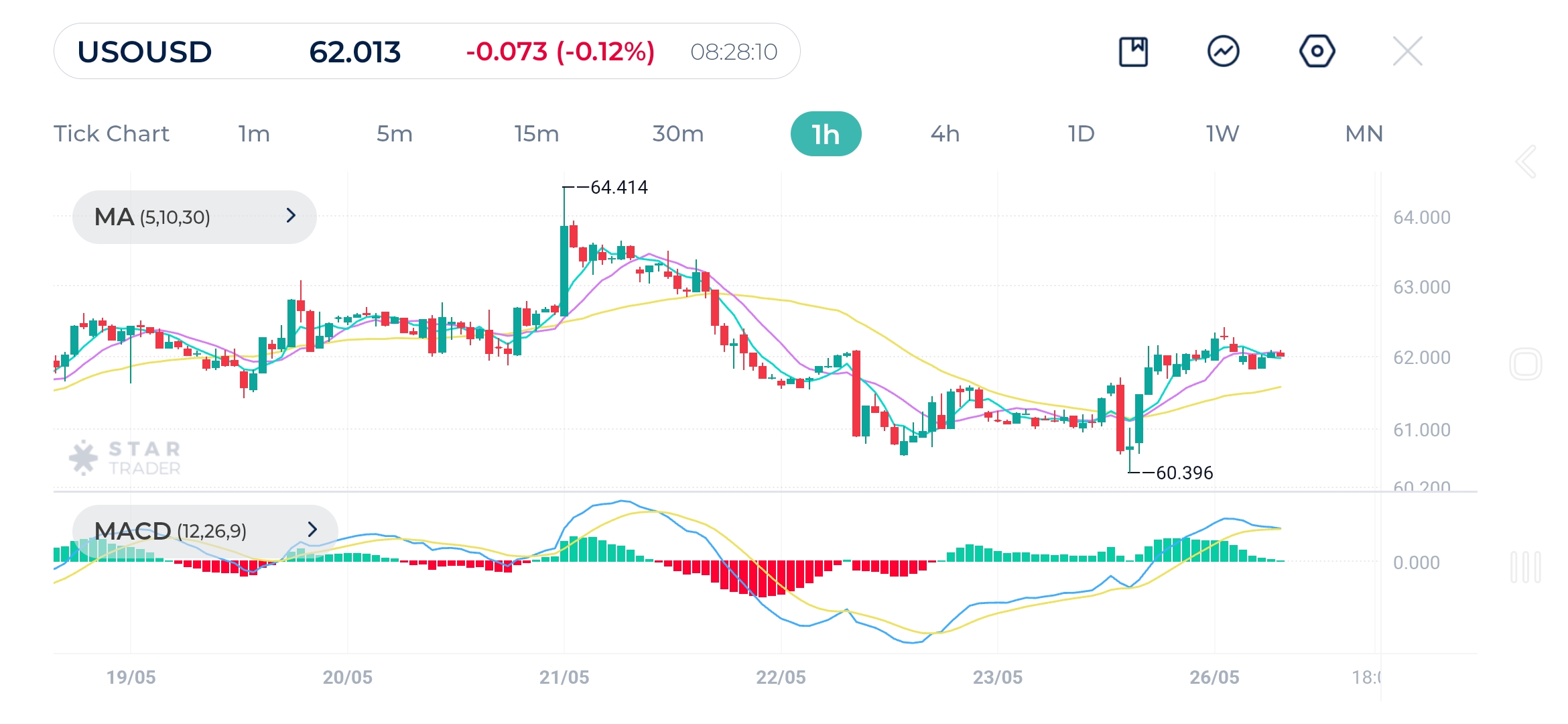 Oil prices have been fluctuating for the past two weeks. After hitting $64.41, price dropped to $60.39, then slightly rebounded to $62.00. Dynamic support level of moving average 30 is holding prices above. A retracement toward this moving average could push prices higher.