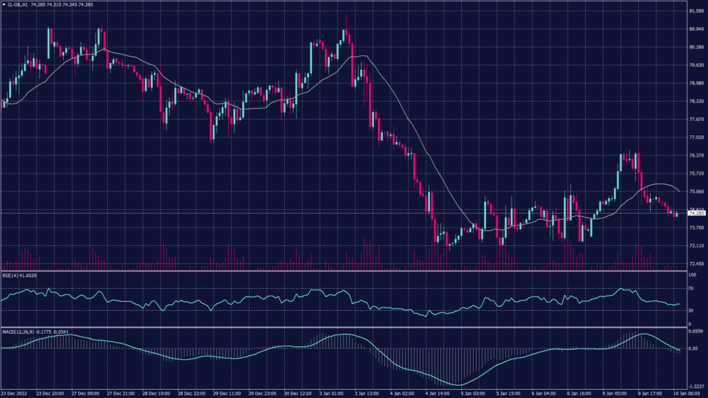 On the hourly chart, the WTI chart moves in a wide horizontal range between 73.60 and 75.00 while staying inside the declining channel on the daily chart. Technical indicators stand neutral and moving averages signal a slight advancement from the current prices to $75.