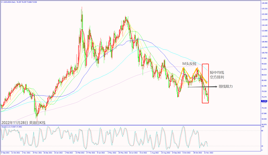上周一(21日)沙特否认OPEC+增产报道,也让美油价格逆势飙涨近7%。上周二(22日)美联储梅斯特对加息表示放缓利好股指,推升美油价格冲高至82.00关口上方整理。上周三(23日)美国和欧盟预期公布对俄罗斯采购石油上限低于市价,以及上周五(25日) 传欧盟恢复对俄罗斯石油价格上限谈判,造成美油价格反转大跌超6%。