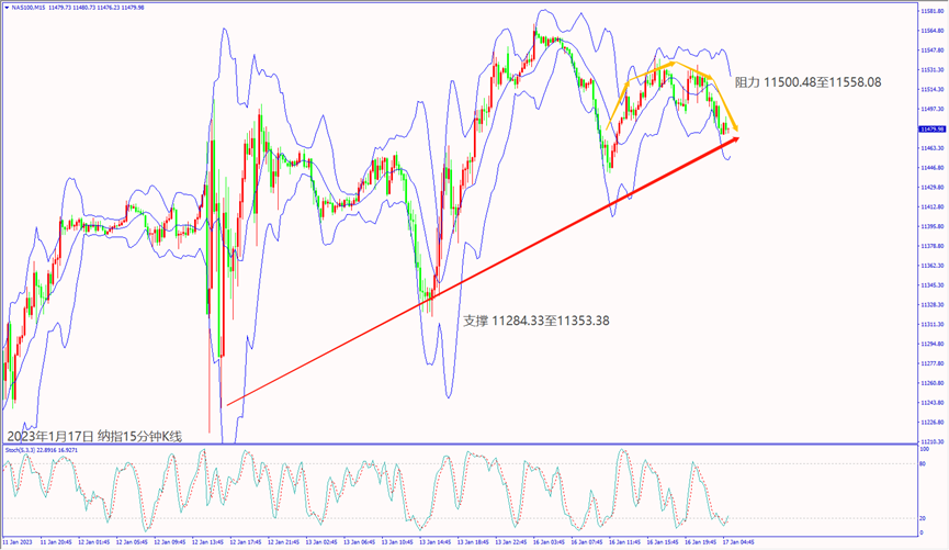 昨天(16日)受到俄乌冲突影响,造成欧美股指下跌近1%。预期今天(17日)德国公布CPI数据下降利淡加息,德指若守住小时布林带下轨线15,095,建议可短多操作。预期今天美国公布制造业数据不佳,纳指一旦跌破5日均线11,470,建议可短空操作。