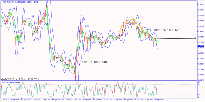 日级别线图,出现避雷针反转信号,一旦跌破5日均线,可能回测240日均线;15分钟K线,昨天出现圆形顶反转,1.2600关口冲不过,大有可能下探支撑。