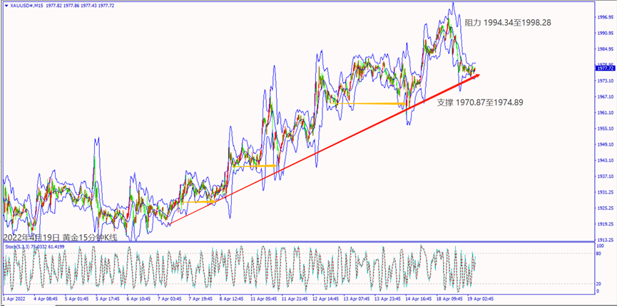 日级别线图,近期在1970关口上方震荡,守住5日均线,有望延续涨势;15分钟K线,短线形成盘涨,守住上升趋势线,大有可能挑战上方阻力。