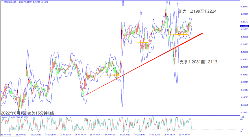 日级别线图,十字星反转信号, 1.2200关口冲不过,可能回测10日均线;15分钟K线,短线形成盘涨,上升趋势线若掼破,大有可能下探支撑。