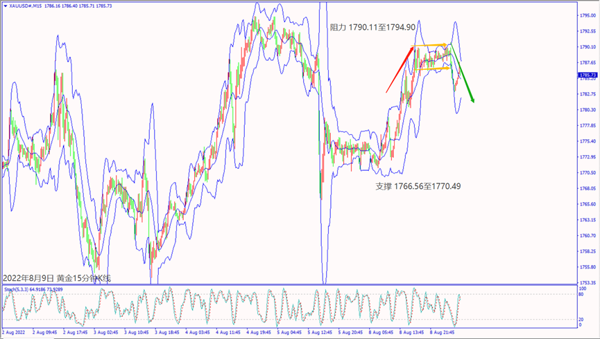 日级别线图,近三天在1790关口下方震荡,60日均线冲不过,可能回测10日均线;15分钟K线,出现箱型反转,前波盘整盖顶,大有可能下探支撑。