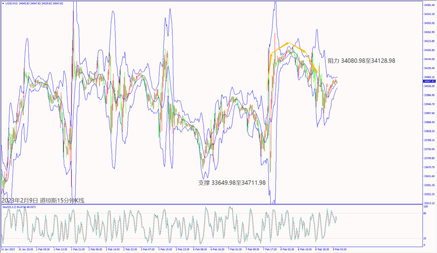 昨天(8日)多位美联储官员预期持续加息抑制通胀,造成纳指跌近2%和道琼斯跌约200点。预期今天(9日)欧元区公布CPI下降利淡加息,德指若守住小时布林带中轨15,466,建议可短多操作。预期今天英国央行行长贝利重申加息利淡股指,道琼斯一旦跌破5日均线34,000,建议可短空操作。