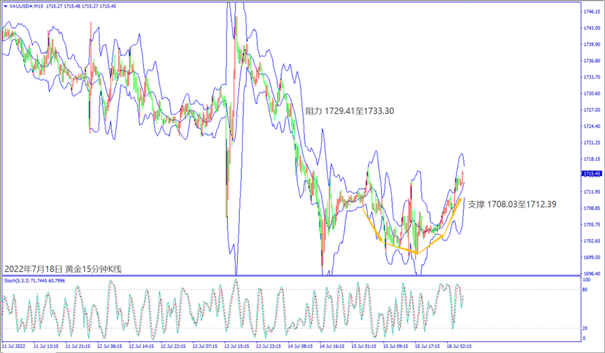 上周五(15日)美国公布经济数据好坏参半,造成美元下跌和美股上涨,黄金价格介于1710美元附近震荡。美联储多位官员预期7月维持加息75个基点利淡美元,一旦美元指数扩大下跌,黄金价格守住1710关口,建议可短多操作。