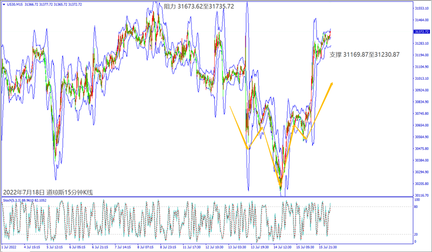 上周五(15日)美国公布零售销售和消费者信心指数利好,带动道琼斯和纳指扩大上涨逾2%。预期今天(18日)欧洲央行官员重申7月加息25个基点,德指一旦跌破小时布林带下轨线12,806,建议可短空操作。预期今天美国财报周传出利好消息,道琼斯守住小时布林带中轨31,280,建议可短多操作。