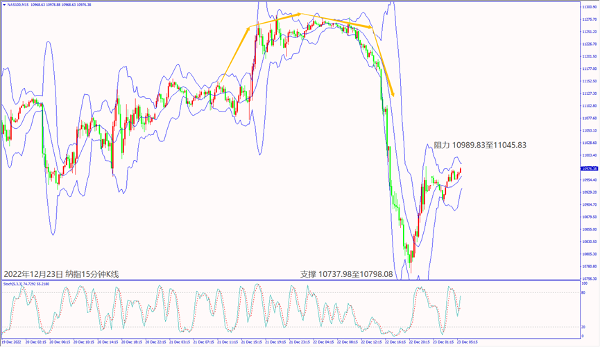 昨天(22日)乌克兰总统访美获得防空军事武器援助,造成市场担忧全球经济面临衰退,也让欧美股指皆下跌近3%。预期今天(23日)美国公布PCE物价下降利淡加息,道琼斯若守住5日均线33,085,建议可短多操作。预期今天美国消费者信心指数不佳,纳指冲不过小时布林带上轨线11,020,建议可短空操作。