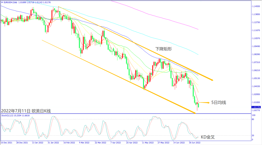 上周二(5日)瑞典和芬兰宣布签署协议书加入北约,引发市场对欧洲地区地缘政治问题,造成欧美暴跌创近20年新低,也让镑美大跌逾210个点创1年8个月新低价格。上周四(7日)清晨美联储货币会议纪要,预测7月维持加息,以及上周五(8日)美国公布非农就业数据利好,美元指数扩大上涨超300个点,带动美加大涨约240个点,也让欧美扩大下跌约280个点。上周四(7日)英国众多官员宣布辞职来表达对首相约翰逊的不满,因此当天晚上英国首相正式宣布辞任官位,市场乐观英国经济向好让镑美意外大涨约120个点。