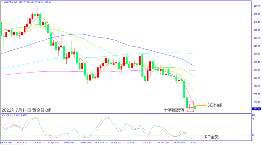 日级别线图,十字星反转信号和KD出现金叉,一旦突破5日均线,可能出现反弹。