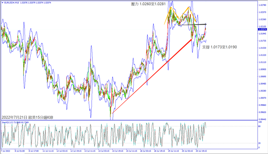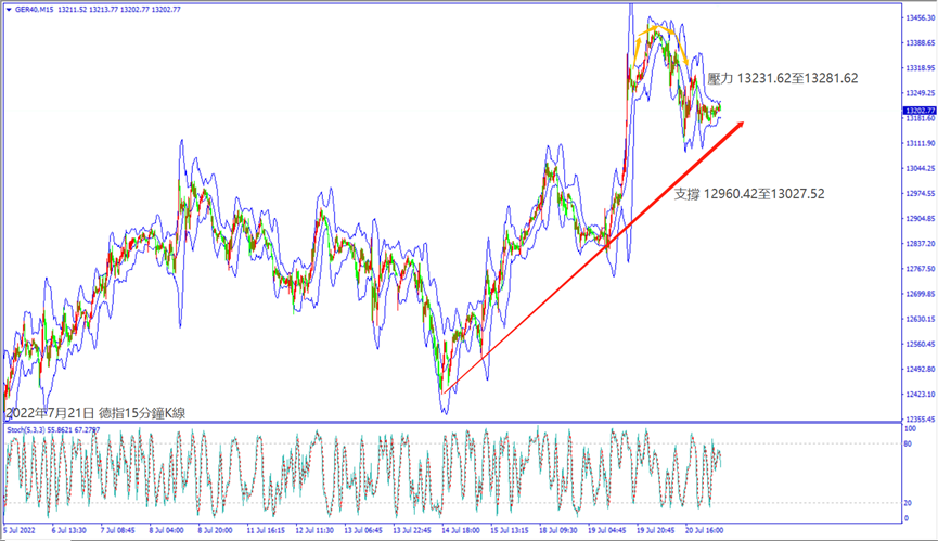昨天(20日)市場擔憂歐盟能源危機問題,一度造成歐美股指皆出現下跌,晚間僅納指逆勢上漲超250個點。預期今天(21日)歐洲央行宣布加息,德指沖不過小時布林帶中軌13,220,建議可短空操作。預期今天美國公佈經濟數據利好,納指若守住小時布林帶下軌線12,355,建議可短多操作。