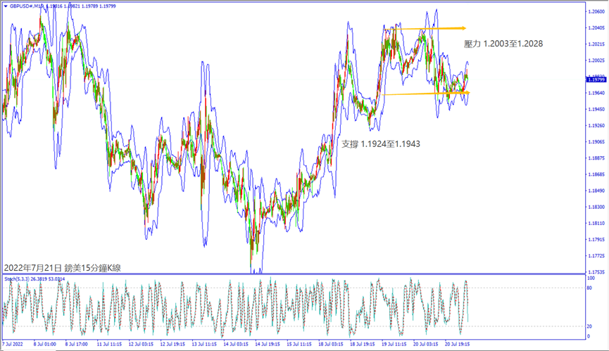 日級別線圖,近三天皆留長上影線,1.2000關口沖不過,可能轉跌;15分鐘K線,短線區間震盪,一旦跌破盤整底部,大有可能下探支撐。