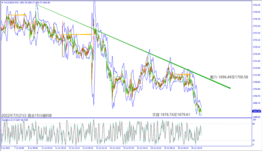 日級別線圖,長黑K摜破1700關口,5日均線反壓,可能延續跌勢;15分鐘K線,短線形成盤跌,沖不過下降趨勢線,大有可能下探支撐。
