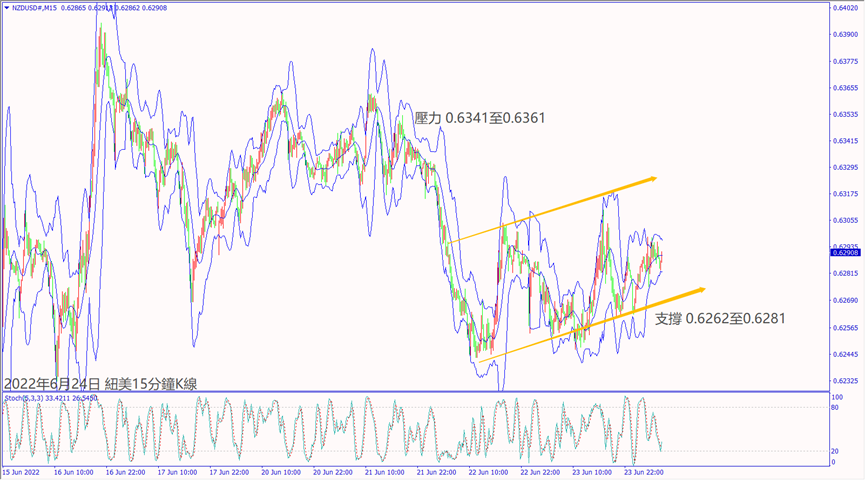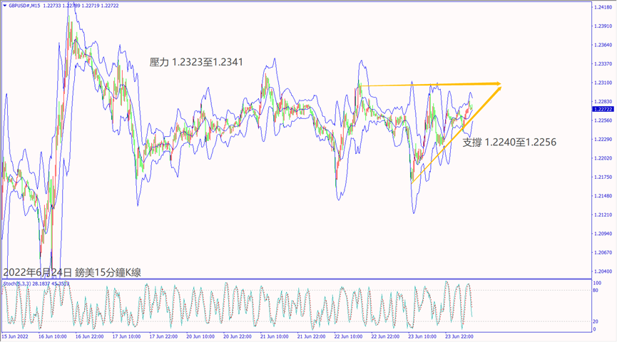日級別線圖,連兩天出現十字線反轉,一旦突破1.2300關口,可能啟動漲勢;15分鐘K線,短線出現上升三角形,盤整頂部若刺破,大有可能挑戰上方壓力。