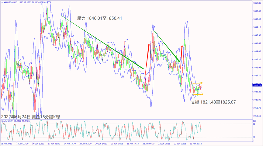 昨天(23日)受到美元和美債收益率震盪影響,黃金價格一度衝高至1846美元後回落。預期今天(24日)美國公佈消費指信心指數不佳,一旦造成美元和美股齊跌,黃金價格若突破小時布林帶上軌線1830關口,建議可短多操作。