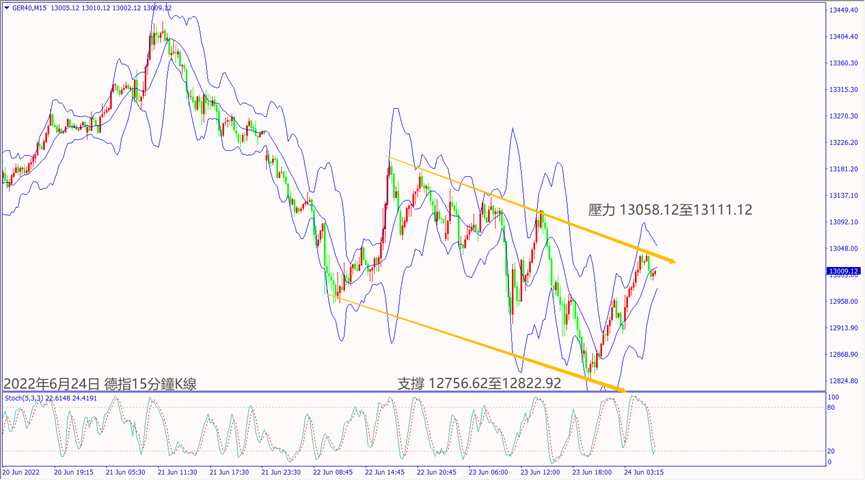 昨天(23日)歐美公佈經濟數據不佳,造成歐美股指一度出現齊跌。晚間美聯儲主席鮑威爾對經濟增長信心喊話,帶動道瓊斯和納指逆勢上漲收復跌勢。預期今天(24日)德國公佈經濟數據不佳,德指一旦跌破小時布林帶中軌12,935,建議可偏空操作。預期今天美國公佈消費者信心指數不佳,納指若跌破小時布林帶中軌11,672,建議可短空操作。