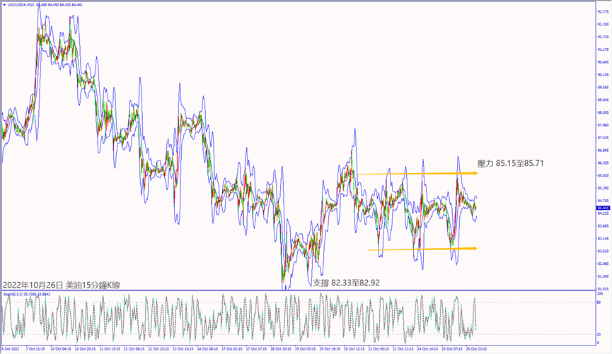 昨天(25日)德國IFO經濟學家表示冬季面臨經濟衰退,造成德指和道瓊斯大跌逾200點。晚間美國公佈經濟數據大都不佳引發市場預測美聯儲加息趨緩,市場買盤推昇道瓊斯和納指逆勢漲超1%。國際能源署表示世界需要俄羅斯石油流入市場,一度造成美油價格下跌約2%。沙特能源部長表示美國正在耗盡應急儲備石油,以及歐美股指逆勢大漲,帶動美油價格上漲近4%。週三(26日)清晨公佈API原油庫存高於市場預期,也讓美油價格回落至84.70美元附近整理。