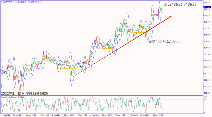 日級別線圖,連續上漲KD多方過熱,136.00關口若摜破,可能回測5日均線;15分鐘K線,短線形成盤漲,上升趨勢線若跌破,大有可能下探起漲支撐。