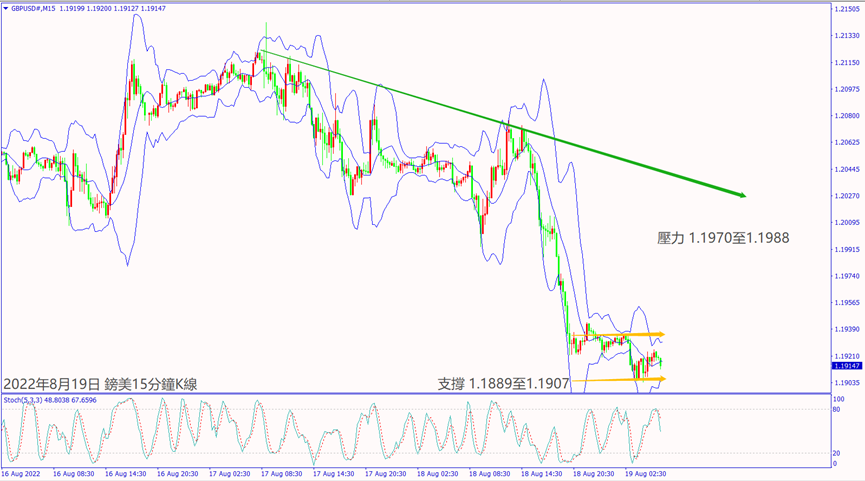 日級別線圖,連續下跌KD空方背離,守住1.1900關口,可能上看5日均線;15分鐘K線,短線區間震盪,一旦突破盤整頂部,大有可能挑戰上方壓力。