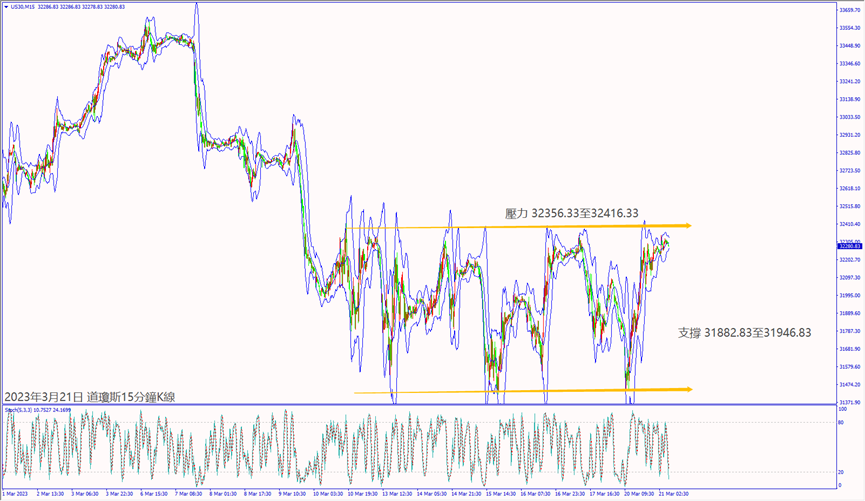 昨天(20日)受到瑞信AT1債券敞口影響,一度造成歐美股指跌近2%。晚間歐美官員對該問題皆表示影響不大,也讓道瓊斯和納指逆勢漲超2%收復跌勢。預期今天(21日)歐元區經濟數據大都不佳,德指沖不過小時布林帶上軌線15,084,建議可短空操作。市場預期本周美聯儲利率決議宣布加息,道瓊斯沖不過小時布林帶上軌線32,342,建議可短空操作。