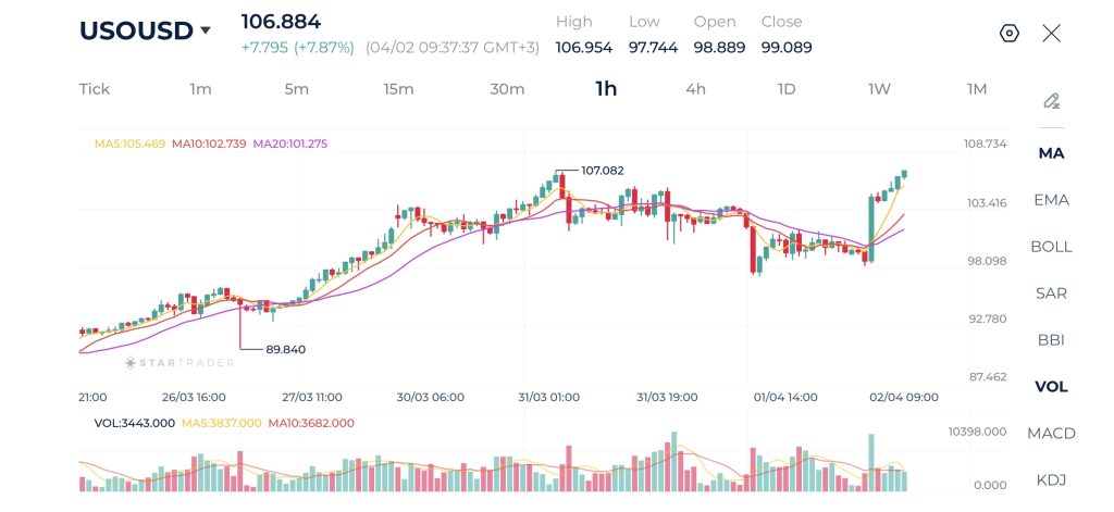 Dầu WTI đang giao dịch quanh mức $106.88 và hiện đang cho thấy đà tăng trưởng mạnh mẽ sau một cú bứt phá sắc nét. Giá đã hình thành một đợt tăng xung lực mạnh từ vùng $98, vượt lên trên các mức kháng cự then chốt và nằm trên tất cả các đường trung bình động quan trọng.